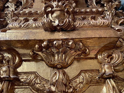 The five altars each side behind arches covered with mollusc-like decor, the groining of the ceiling, the huge proscenium arch before the high altar and the dramatic climax of the high altar cavern itself all glittering with gold leaf. Amazing! Sitwell even compares it with a golden age Hindu temple. Neither wortds nor photos capture it. Like all great buildings the light, time of day, or hundreds of candles add different dimensions of perception.