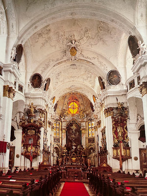 The tower is the most memorable part of the exterior. It dates from 1733, richly ornamented with putti, obelisks and balustrades and is by Steinl and Mungennast. The blue and white decor is so memorable from the river/It is probably the finest Baroque tower in Austria. It seems to grow out of the terrace, almost like a tree trun